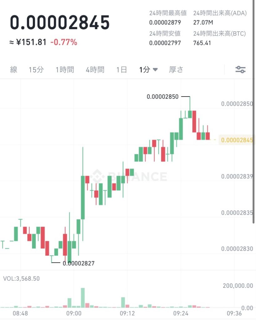 ステーキング時の6時44分から3時間程経った時点でのBinanceでのADA (エイダ)コインの価格です。