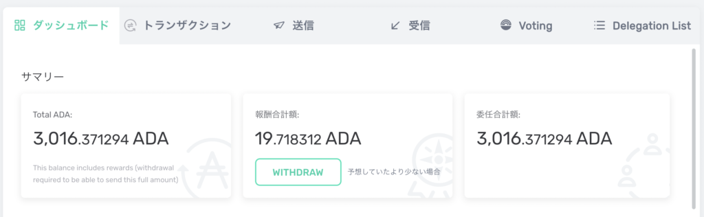 この時のADA (エイダ)コインの金額が179.28円ですのでステーキングでの報酬は、約346円です。
