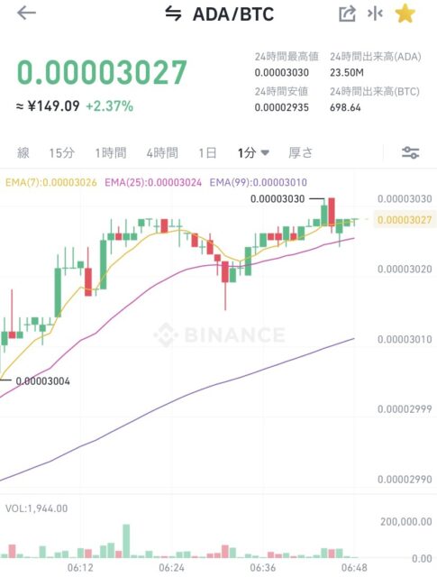 ビットコインに対して、ADA (エイダ)コインは2,106サトシです。ビットコイン建は、先週と比べて210サトシ程上がっています。
