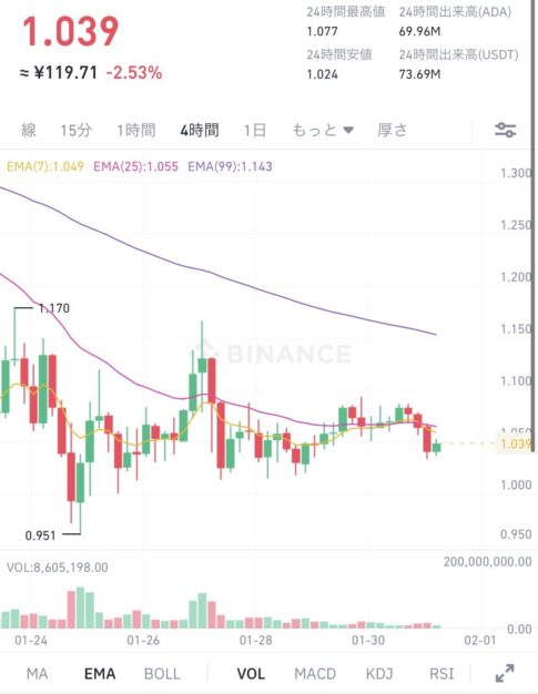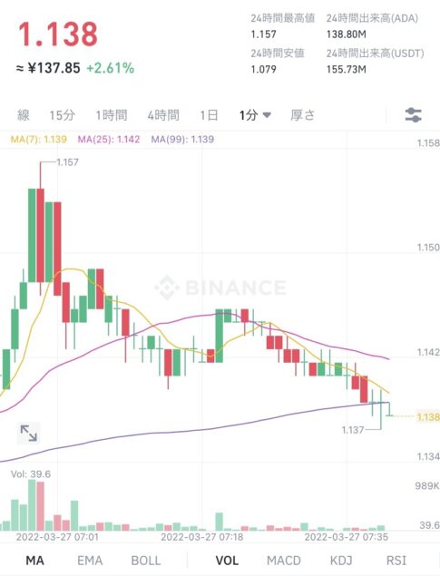 今回も無事に6時30分に起床することができ、6時45分のADA (エイダ)コインの価格になります。